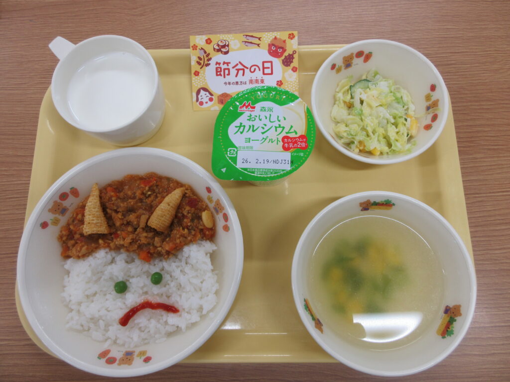 給食 2026.2.3 令和7年度 2月の給食① 2月3日(火)の給食の献立 ・おにさんキーマカレー ・コールスローサラダ ・コンソメスープ ・ヨーグルト ・牛乳 今日は鬼の顔がカレーになった節分メニューでした! お部屋に来た鬼に泣いていたこどもたちもいま […]