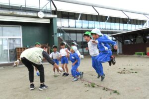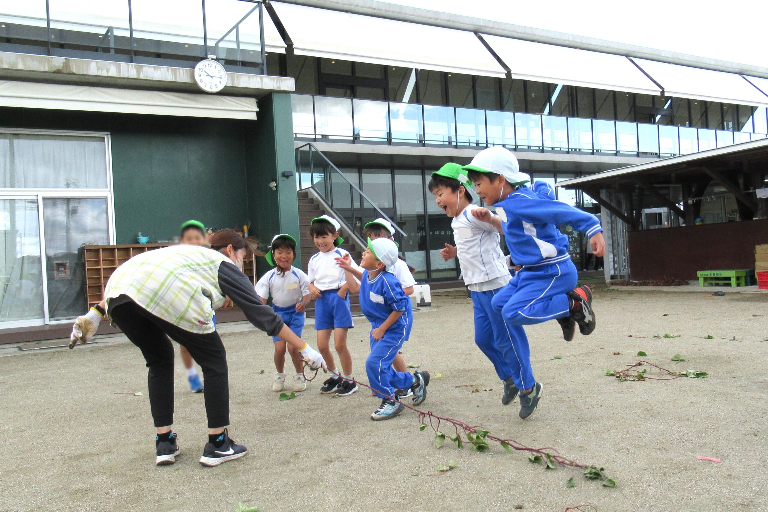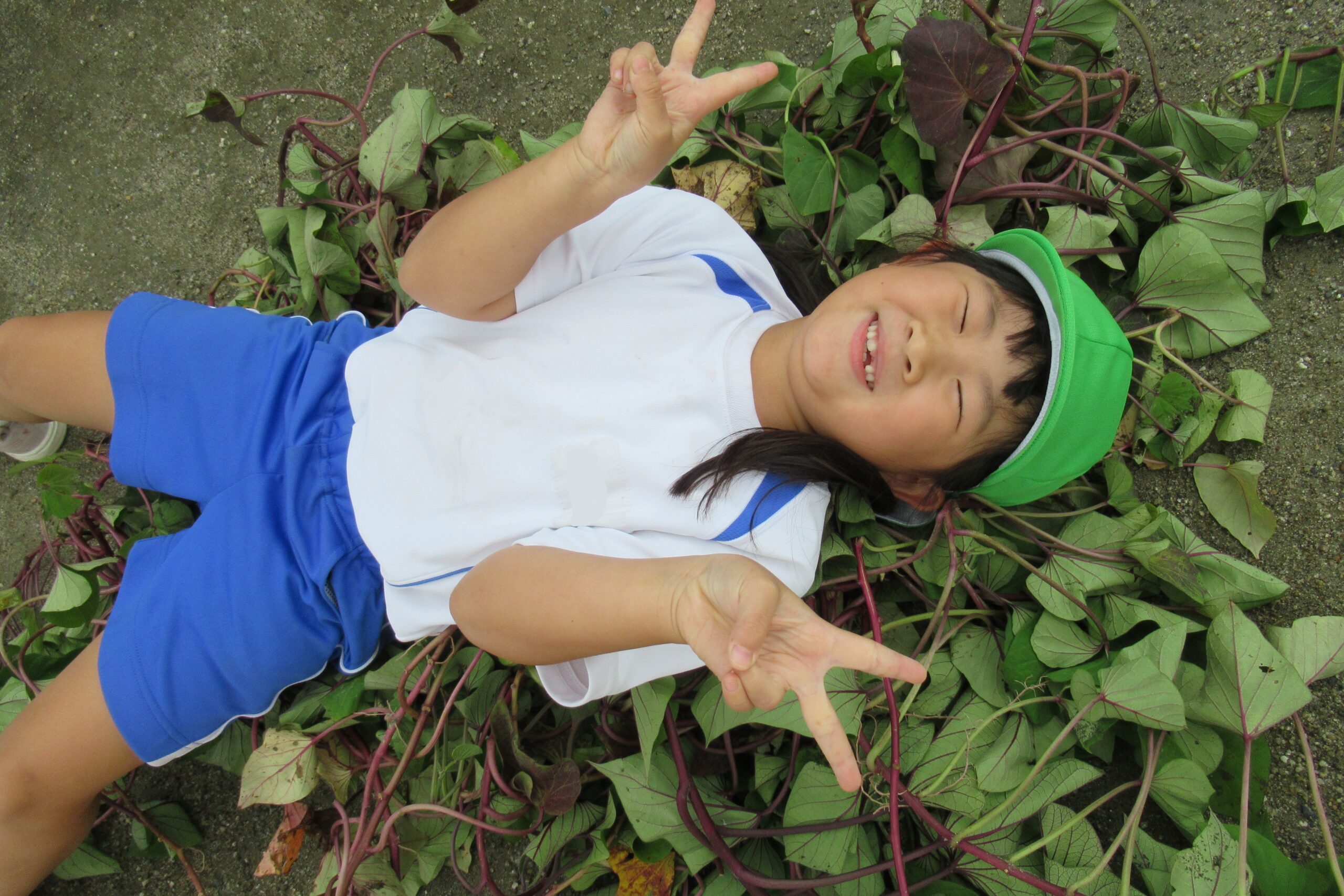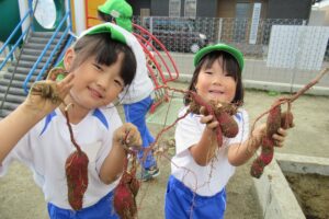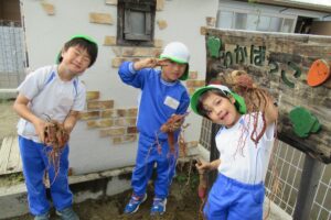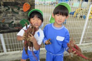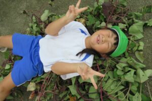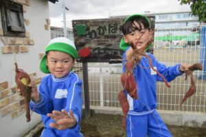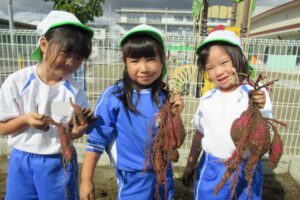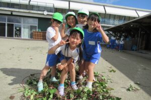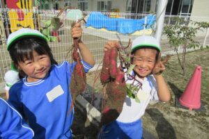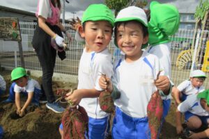年長クラス 2025.10.22 令和7年度 10月の様子「年長さつま芋ほり」 10月17日(金)は、年長組のこどもたちがさつま芋ほりを行いました!自分たちで育てたさつま芋なので、喜びもひとしおのようでした♪掘ったさつま芋は、11月11日の収穫感謝祭まで甘くなるよう園庭に並べています!さつま芋ほりのあとは、つた遊びも楽しみました♪