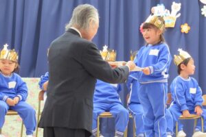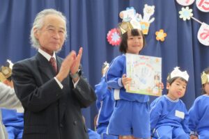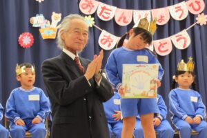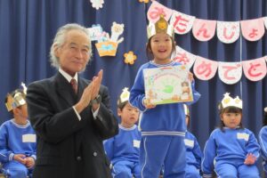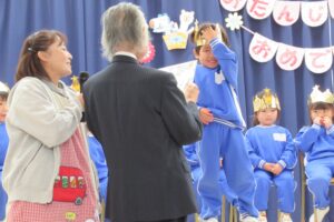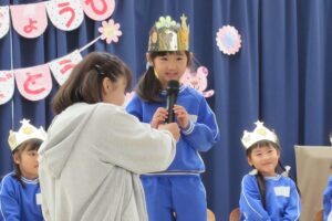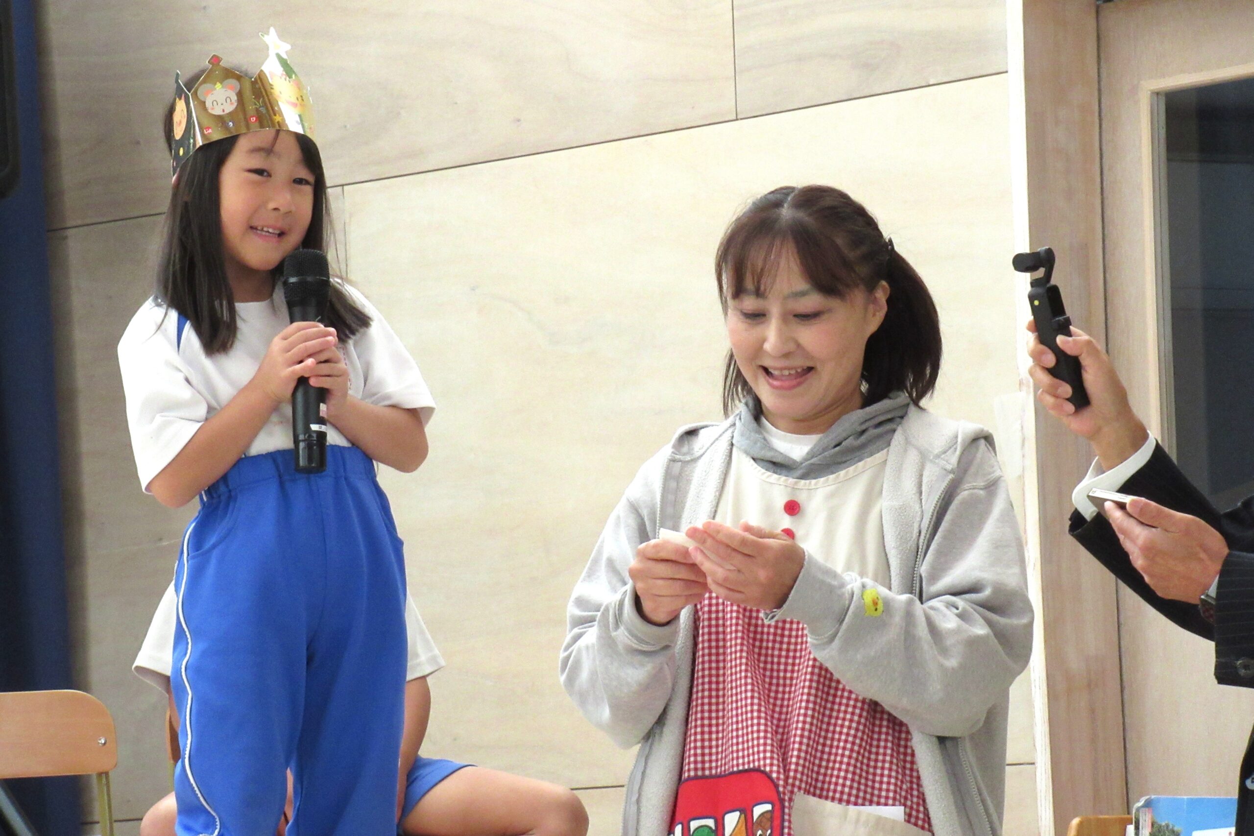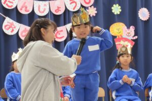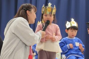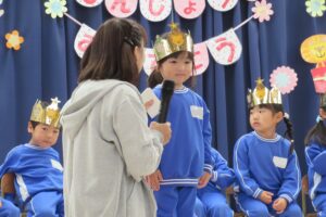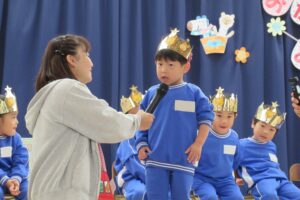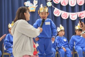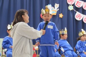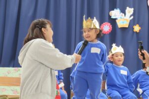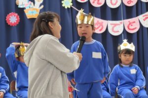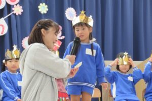 全クラス 2025.10.23 令和7年度 10月の様子「誕生会」 10月22日(水)は、10月生まれの誕生会が行われました!インタビューにしっかり答える子、また答えられるようになった子、注目されて緊張している子など様々でしたが、一人ひとりの成長が見られました!!