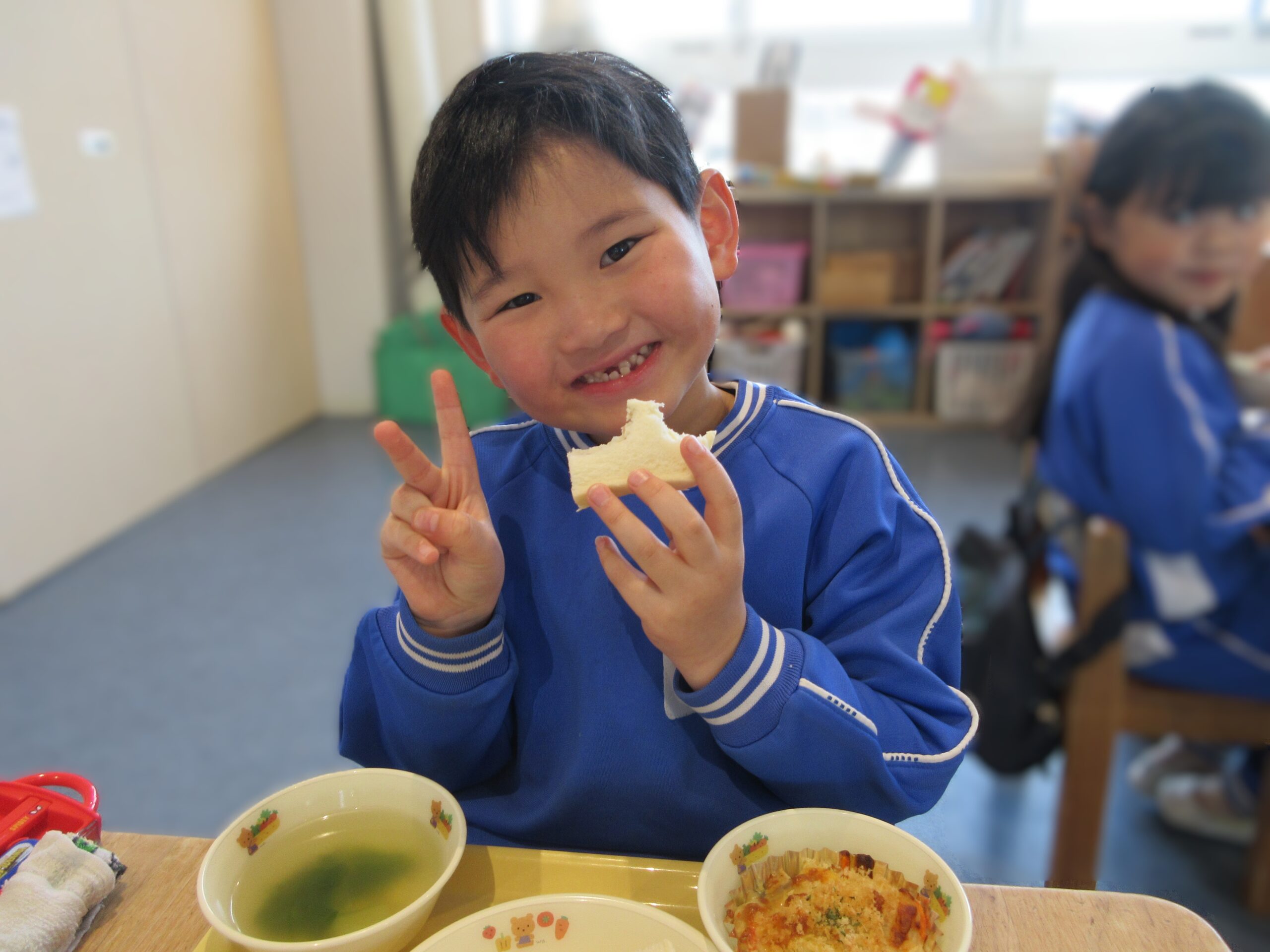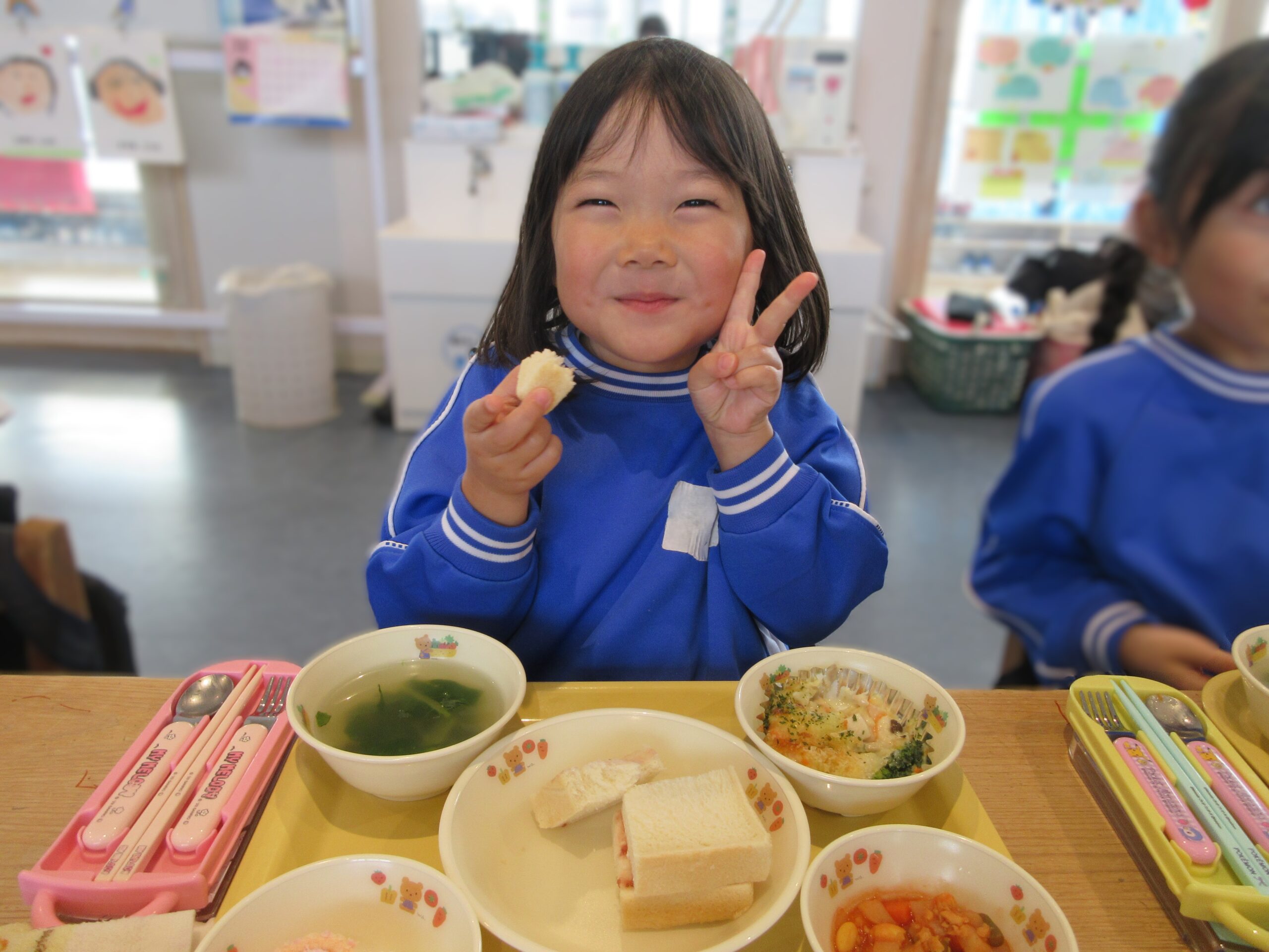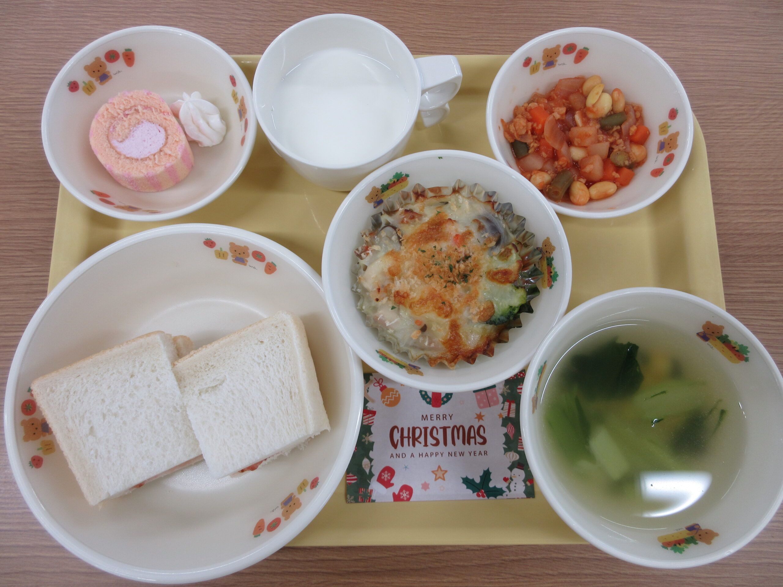 給食 2025.12.18 令和7年度 12月の給食 12月17日(水)の給食の献立 ・ジャムサンド ・チキングラタン ・ケチャップビーンズ ・コンソメスープ ・いちごケーキ ・牛乳 12月17日(水)の給食はクリスマスお誕生日会メニューでした🎄 園舎内にチキングラタンのいい匂いがふんわりと漂い始めると、子どもたちは「今日の給食はなに?」とワクワク💕 先生から給食メニューを教えてもらうと、「やったー!!」とスペシャルな給食に大喜びしていました♪