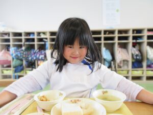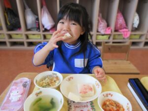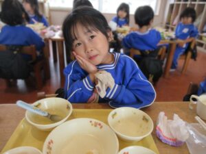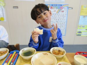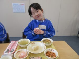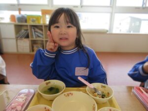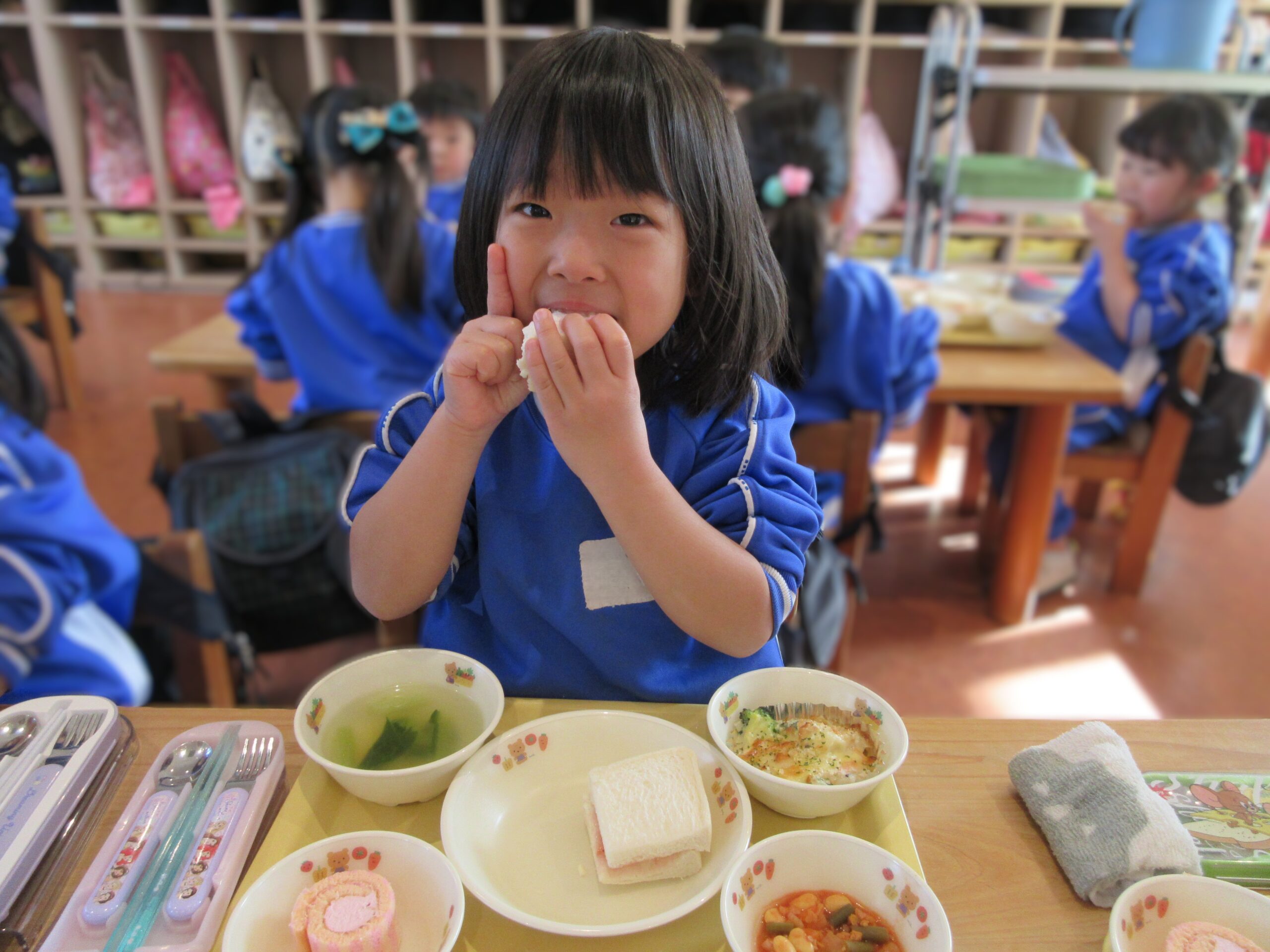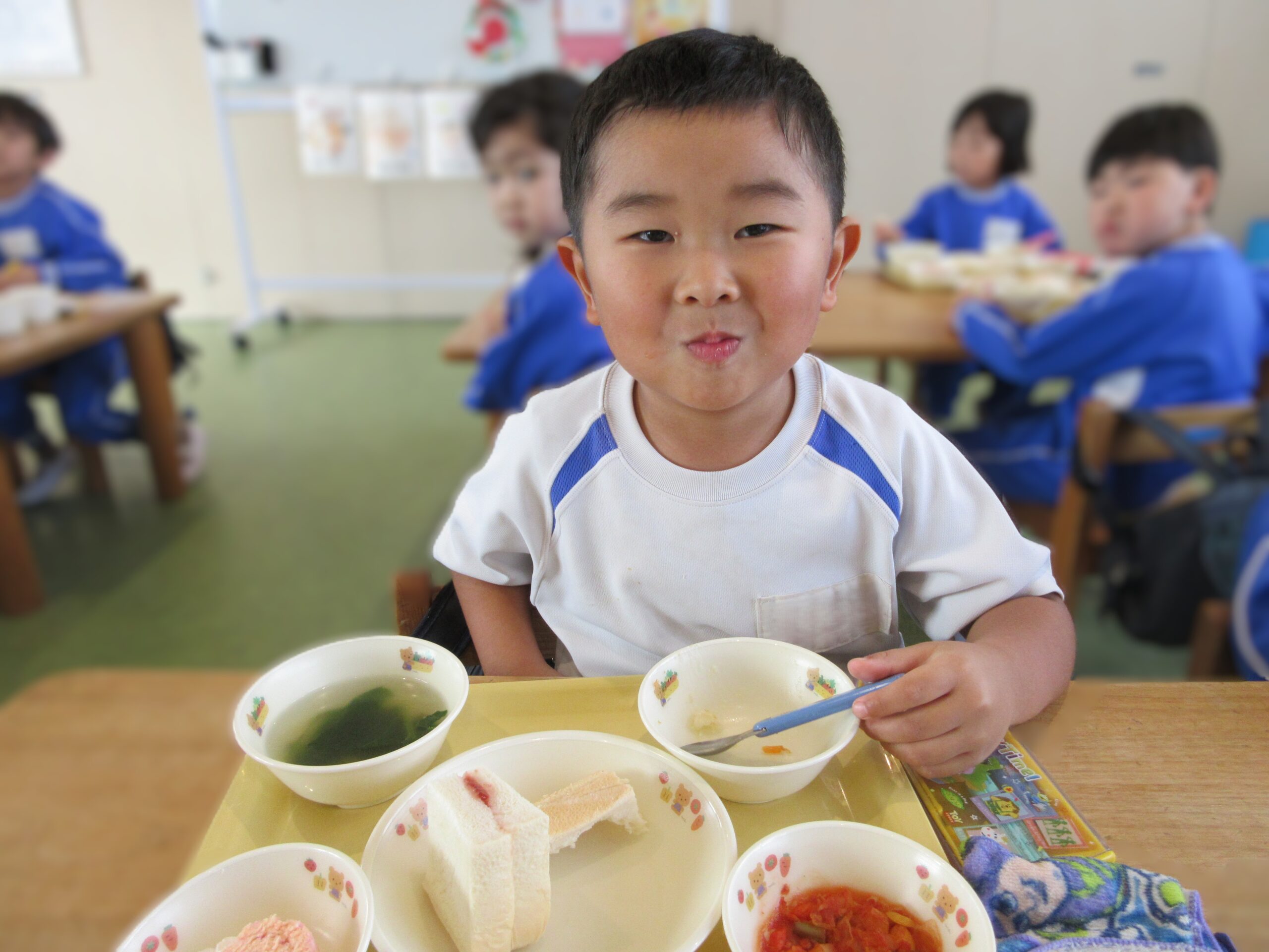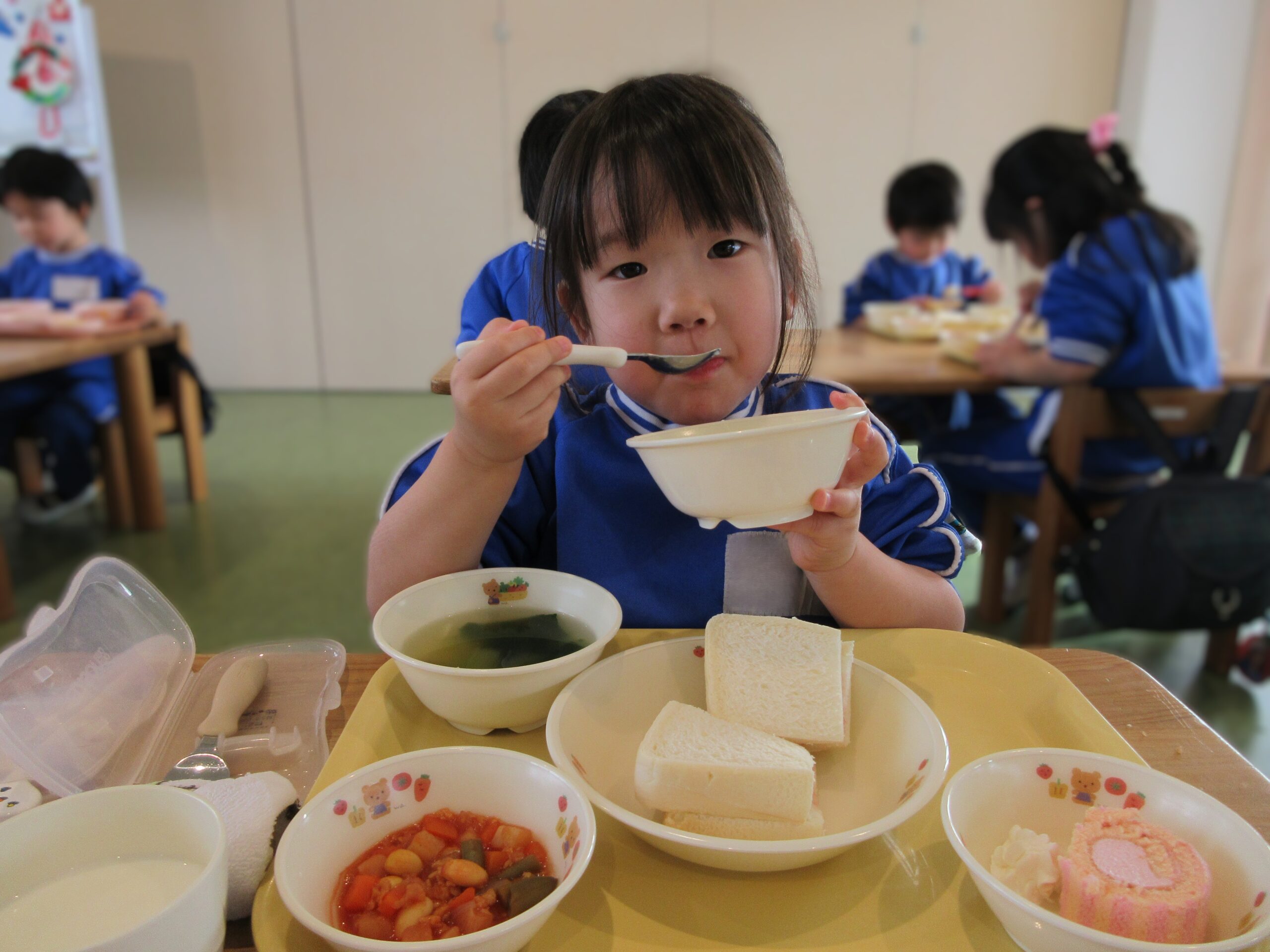 給食 2025.12.18 令和7年度 12月の給食 12月17日(水)の給食の献立 ・ジャムサンド ・チキングラタン ・ケチャップビーンズ ・コンソメスープ ・いちごケーキ ・牛乳 12月17日(水)の給食はクリスマスお誕生日会メニューでした🎄 園舎内にチキングラタンのいい匂いがふんわりと漂い始めると、子どもたちは「今日の給食はなに?」とワクワク💕 先生から給食メニューを教えてもらうと、「やったー!!」とスペシャルな給食に大喜びしていました♪