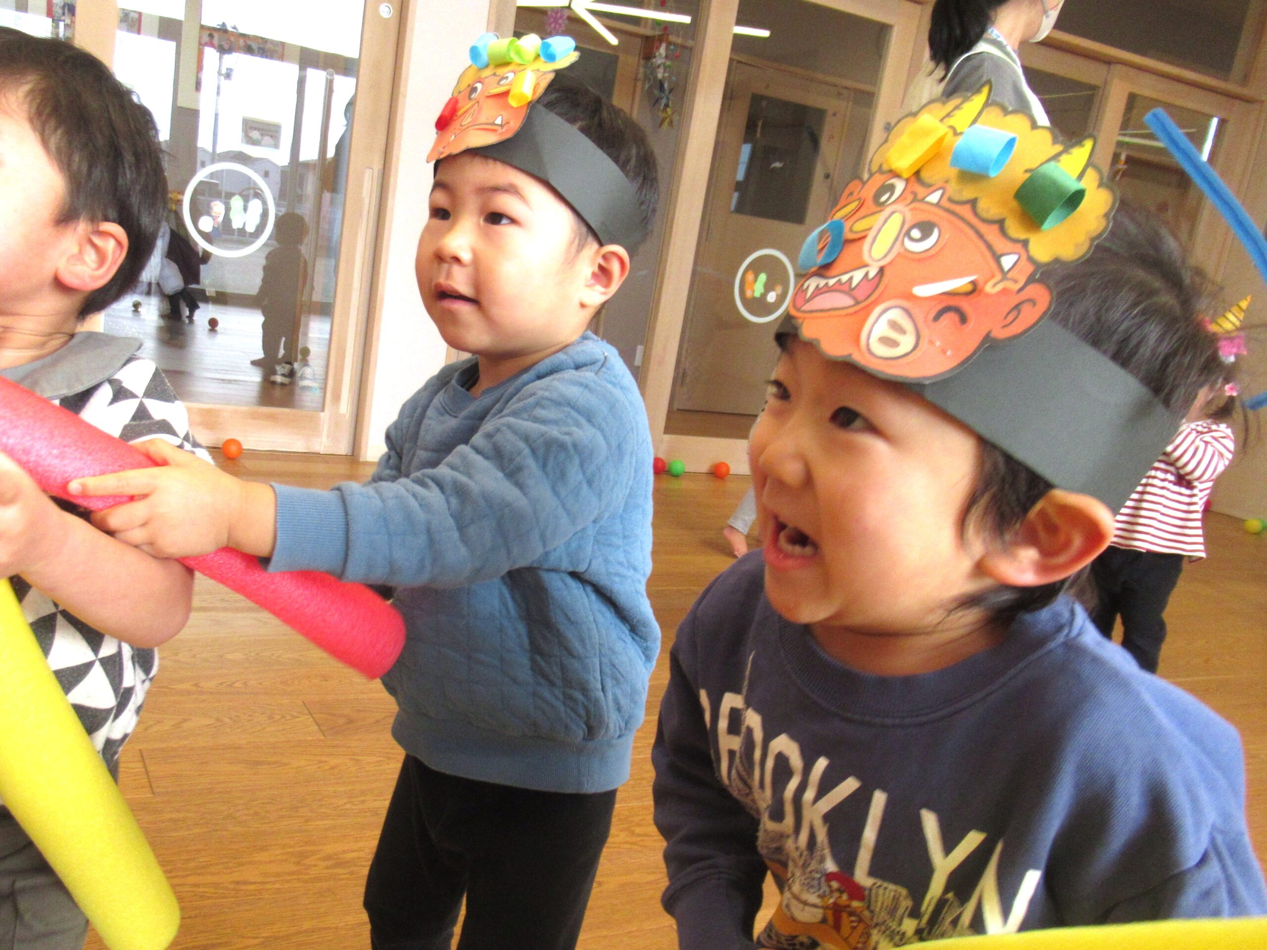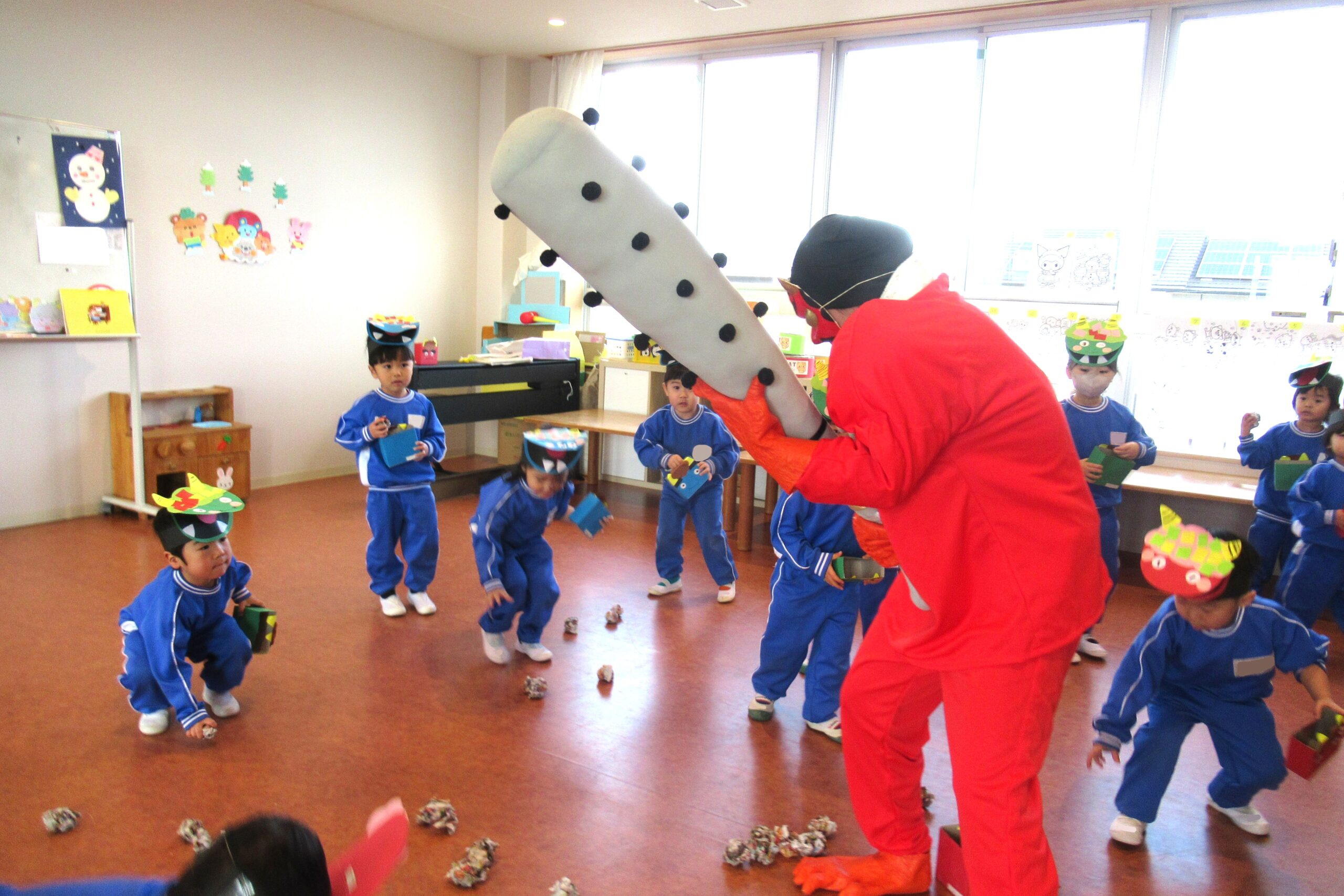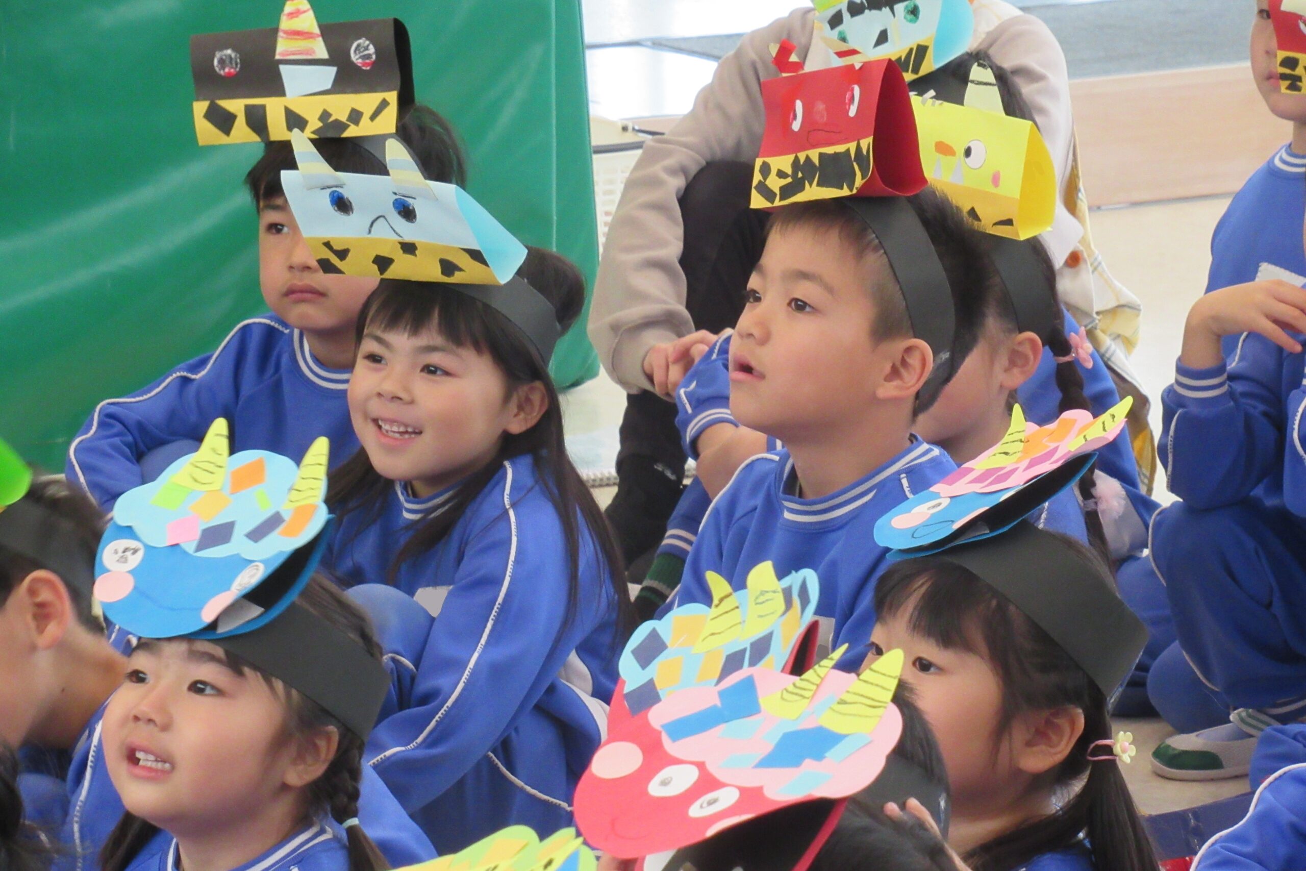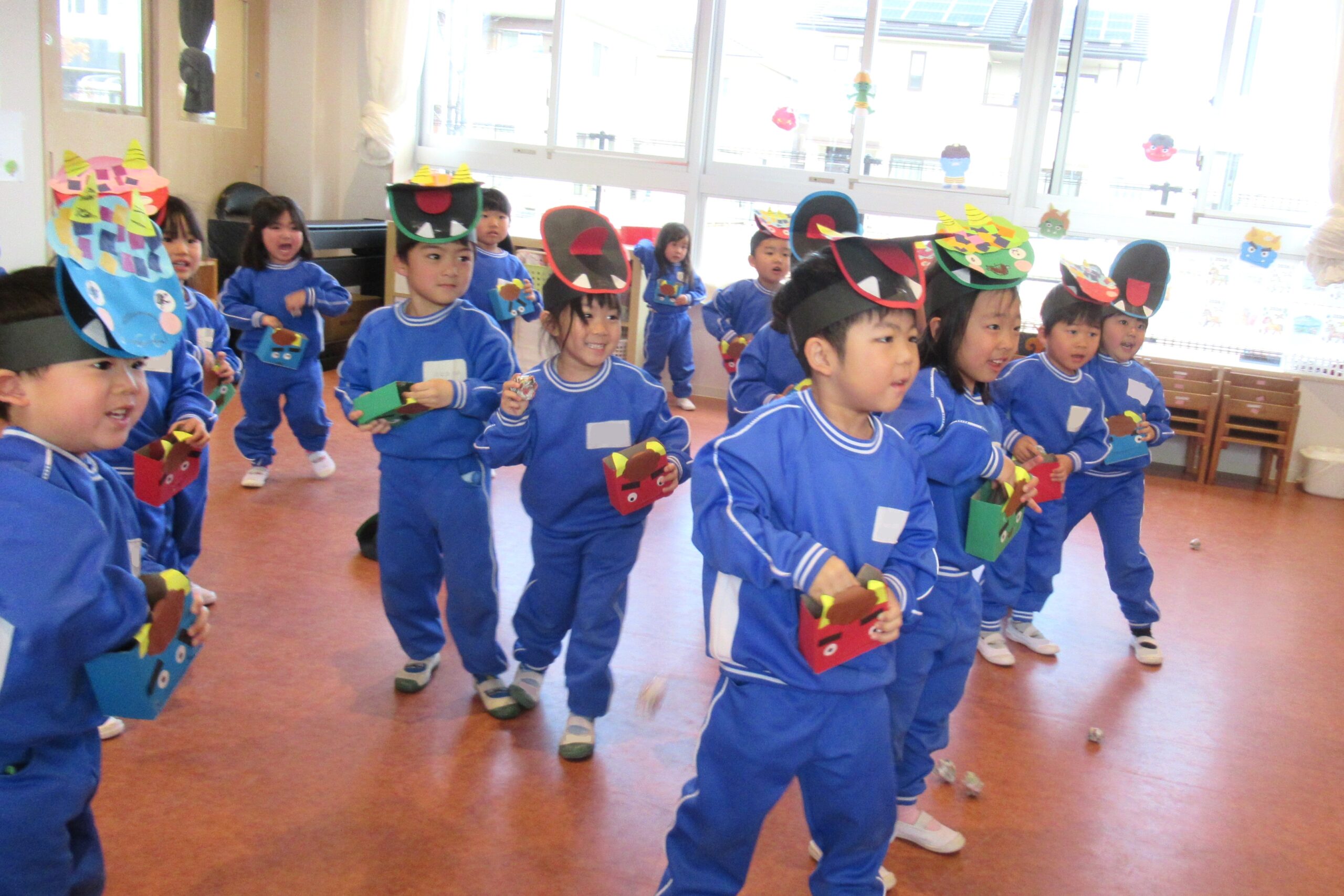2月3日(火)は、豆まき会が行われました。ホールでは、代表のこどもたちが自分で作った鬼について発表をしたり、先生たちの劇を見たり、豆まきの歌を歌ったり、節分行事に触れることができました。その後、クラスで豆まきを行い、自分の中にいる追い出したい鬼を退治しました!「鬼は外、福は内」の掛け声が園内に響きました♪