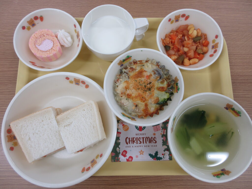 12月17日(水)の給食の献立 ・ジャムサンド ・チキングラタン ・ケチャップビーンズ ・コンソメスープ ・いちごケーキ ・牛乳 12月17日(水)の給食はクリスマスお誕生日会メニューでした🎄 園舎内にチキ […]